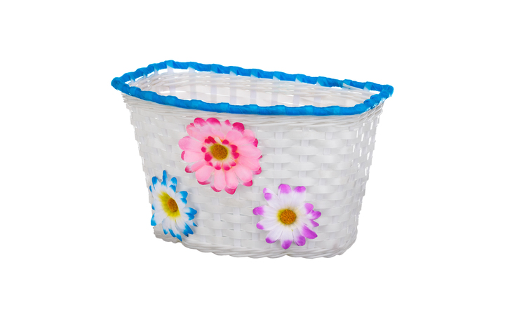 Koszyk dziecięcy wykonany z wytrzymałego plastiku, w kolorze białym i niebieskim. Idealny do zamontowania na rowerze, zapewniający wygodne przewożenie rzeczy podczas jazdy na rowerze. Koszyk charakteryzuje się łatwym montażem oraz estetycznym wykończeniem, co czyni go doskonałym akcesorium dla dzieci. Sprawdzi się idealnie podczas rodzinnych wycieczek rowerowych, zapewniając dodatkowe miejsce na zabawki, picie czy inne niezbędne drobiazgi.